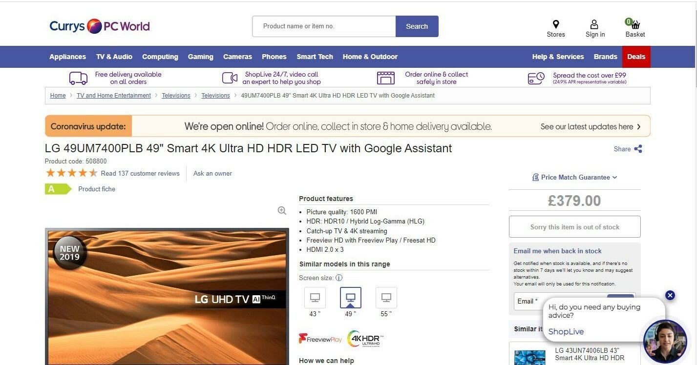 LG 49UM7400PLB 49" Smart 4K Ultra HD HDR LED TV