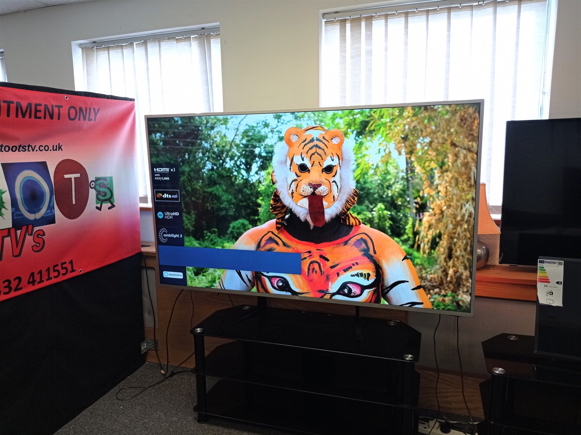 Ex display. Fully tested and calibrated (1 setting). Very slight case dent but nothing that affects the TV or is noticeable. Photographed on universal legs although the actual legs are included.